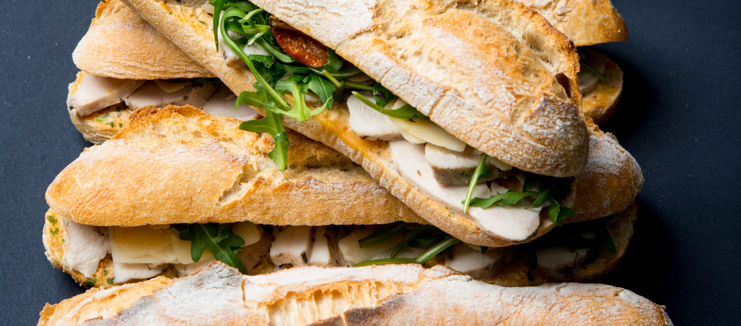 Baguette généreusement composée de poitrine de poulet émincée, roquette, tomates confites, grana, sauce aux tomates confites & basilic